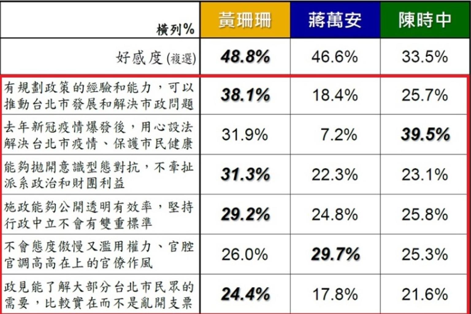 民調也列入適任台北市長「誰當選市長施政能夠公開透明有效率,堅持行政中立不雙重標準」等6項評價,黃珊珊拿下4項冠軍,陳時中僅在用心設法解決台北市疫情這項勝出,蔣萬安則是在不會態度傲慢又濫用權力單項最獲支持。