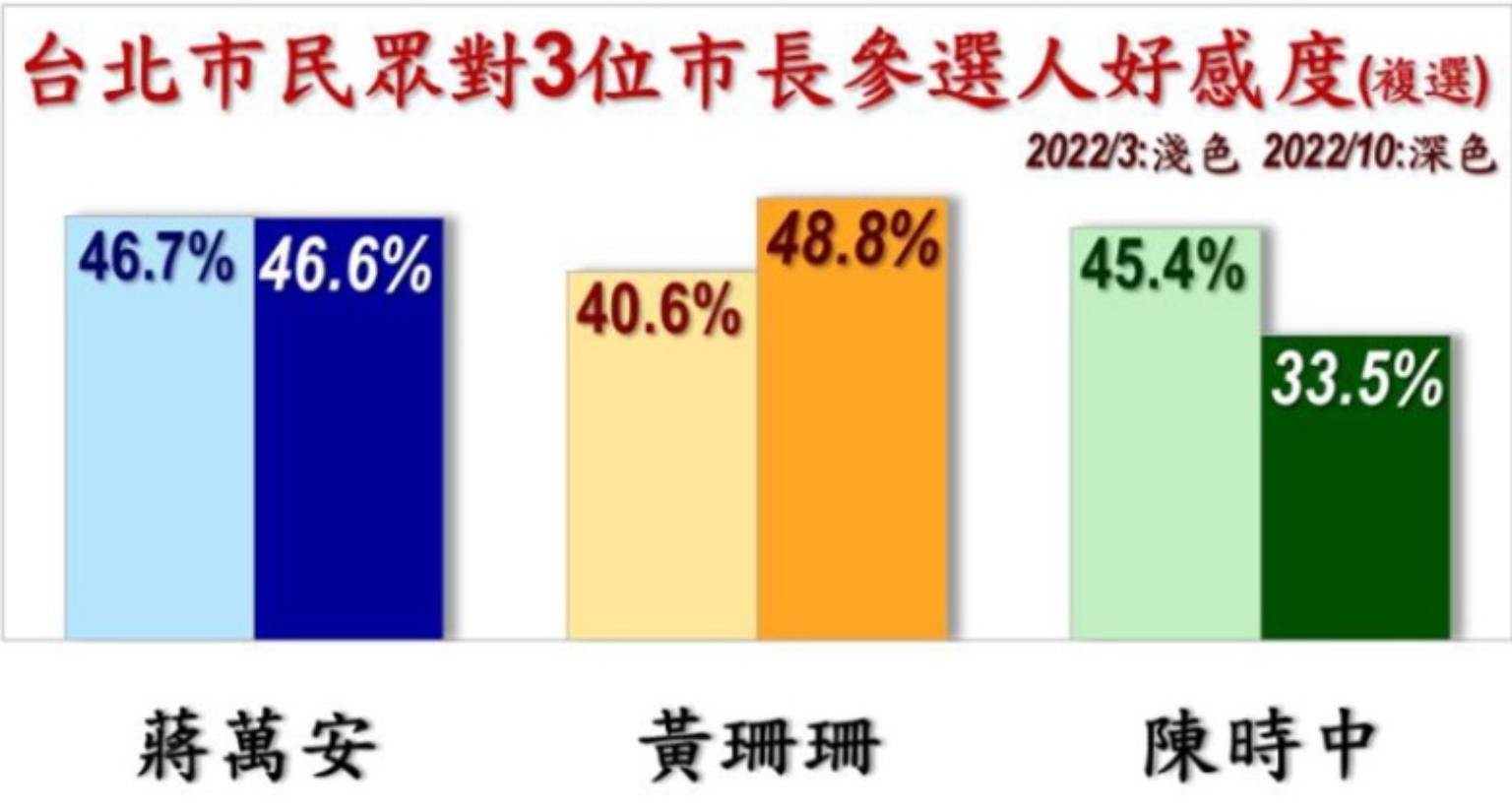 不過有民調專家表示,美麗島民調這次採用先問議題,再進行市長支持度調查,但所問議題對於缺乏行政資歷,與防疫成績的蔣萬安明顯不利,蔣黃陳三人支持度相差不到2%的膠著現象,很有可能是受到議題干擾影響。