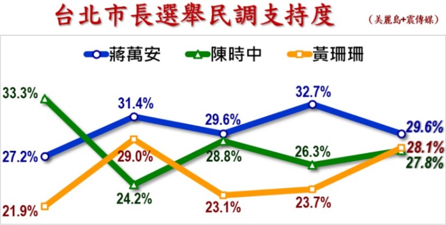 《美麗島電子報》今日公布台北市民調顯示,支持度是國民黨參選人蔣萬安29.6%、無黨籍參選人黃珊珊28.1%、民進黨參選人陳時中27.8%;特別是民調中初探真誠投票(sincere voting)意向,如果只有兩個人很可能會當選,無黨籍參選人黃珊珊不論是對上國民黨參選人蔣萬安,或是民進黨參選人陳時中,都是大幅勝出。