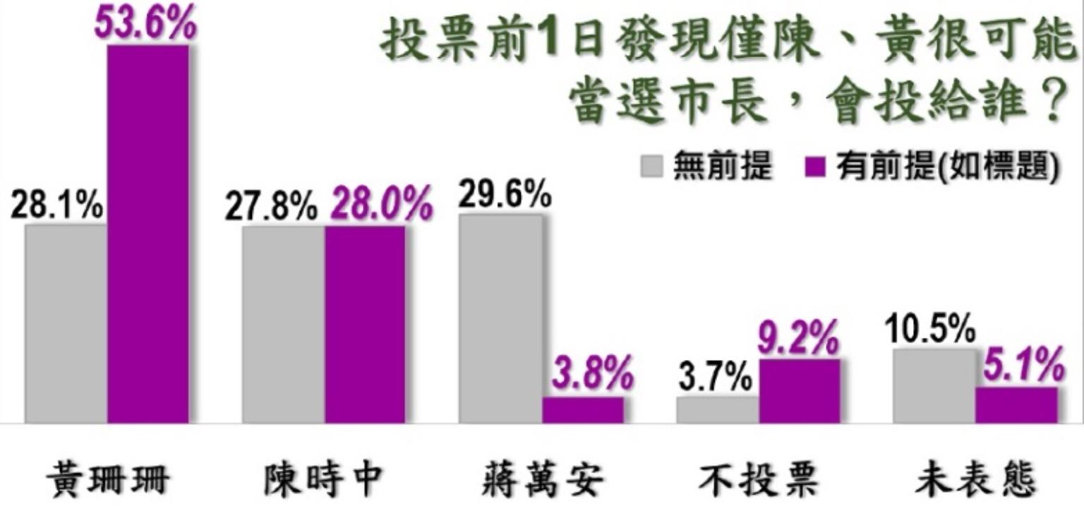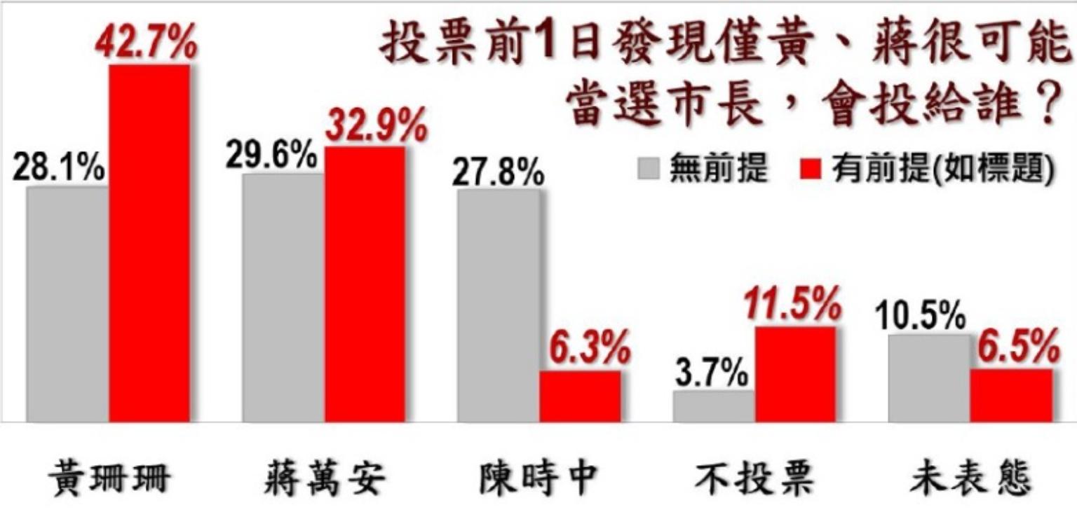 結果黃珊珊為42.7%,比蔣萬安的32.9%,多出9.8%,陳時中僅獲6.3%;經交叉分析發現,原本陳時中的支持者,有極高比例的41%轉向支持黃珊珊,甚至有29.9%轉向不投票或投廢票,僅剩22.6%仍投給陳時中(具真誠投票意向)。
