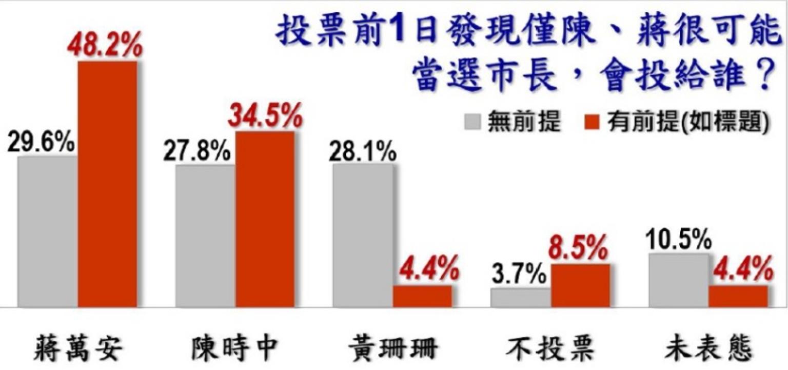 結果蔣萬安為48.2%、陳時中34.5%、黃珊珊僅剩4.4%;經交叉分析,原本黃珊珊的支持者有47.8%轉向支持蔣萬安、16.6%轉向支持陳時中,18.5%轉向不投票或投廢票,15.2%仍投給黃珊珊(具真誠投票意向)。