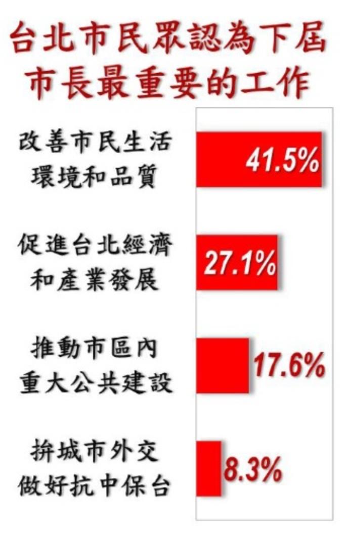 至於台北市民眾認為下一屆台北市長的最重要工作,在完整提示選項後,以改善市民生活環境和品質41.5%為最高,其次依序為促進台北經濟和產業發展27.1%、推動市區內重大公共建設17.6%,至於陳時中多次強調的拚城市外交做好抗中保台僅占8.3%,同樣吊車尾。