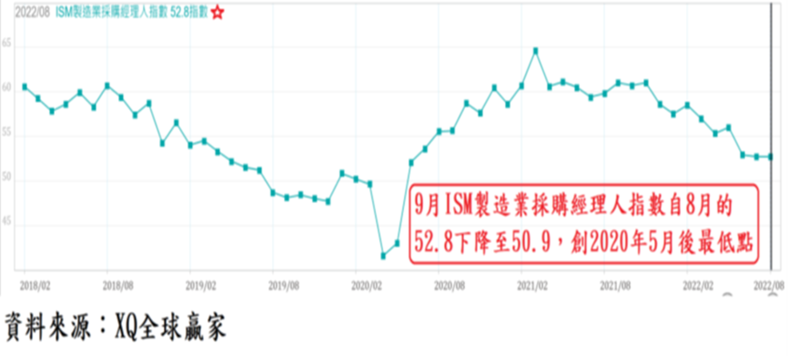 9月ISM製造業採購經理人指數自8月的52.8下降至50.9,低於市場預期的52.2、逼近景氣擴張與收縮的50臨界點、創2020年5月後最低點,顯見美國製造業景氣自第二季以來的趨緩態勢越來越明顯。