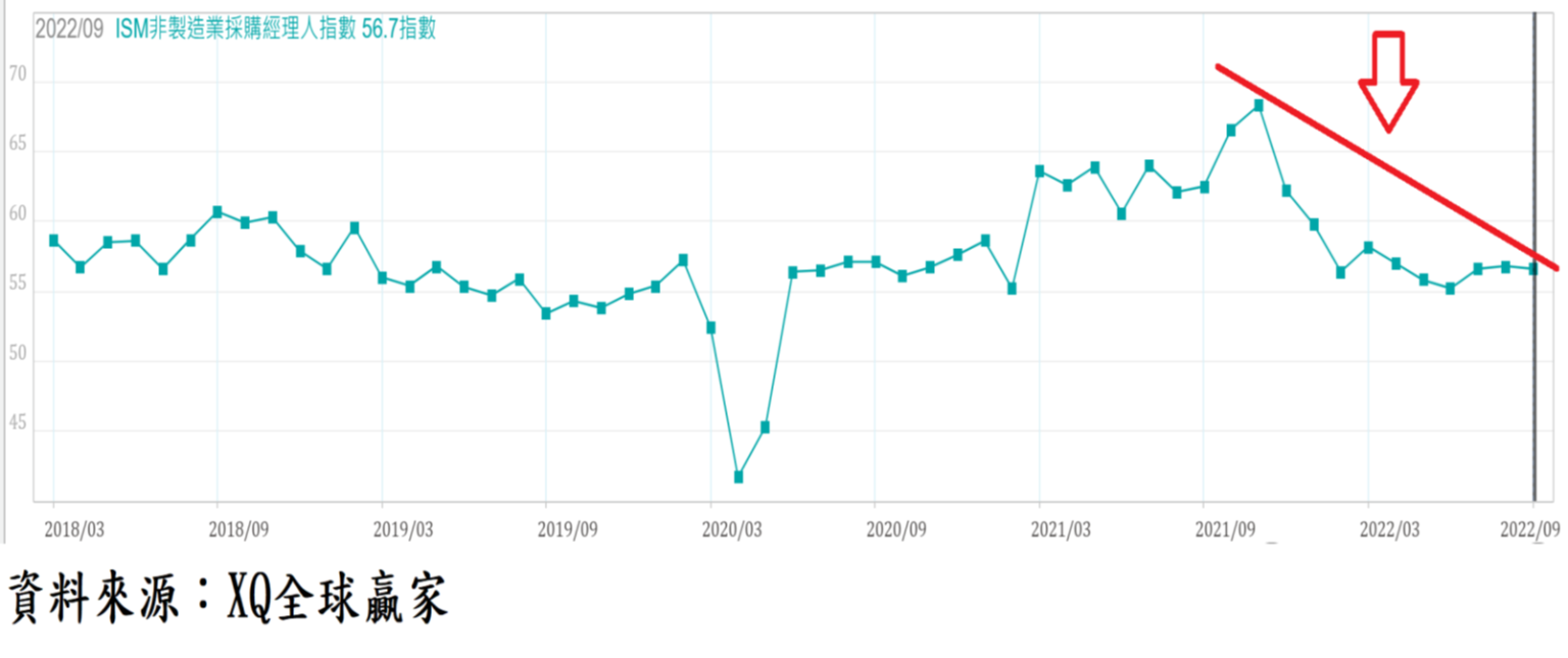 美國非製造業採購經理人指數(ISM)9月自8月的56.9小幅下降至56.7,經濟景氣自2021年底以來出現降溫的趨勢尚未改變,雖連續第28月高於代表景氣擴張臨界點50,顯示整體GDP比重超過八成的服務業,仍在擴張軌道,但非製造業與製造業採購經理人指數(ISM)同步下降的趨勢尚未改變,9月製造業採購經理人指數(ISM)下降至50.9、製造業景氣逼近收縮臨界點,顯示美國總體經濟正處於衰退之中的危機仍未解除。