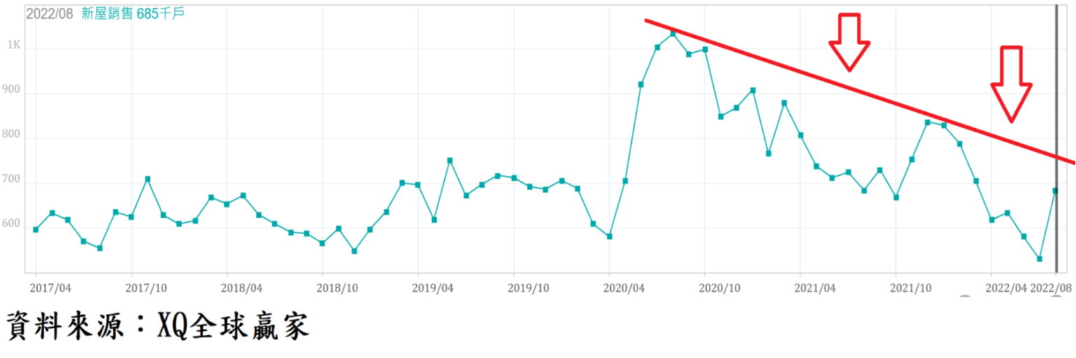美國8月新屋年率銷售戶數下降至68.5萬戶,從7月2016年1月後最低點53.2萬戶,單月出現反彈,月增28.8%,但仍較去年同期微幅年減0.15%,連續6個月較去年同期衰退,顯示疫情期間推高的銷售高峰在2020年8月的103.6萬戶,隨後震盪走低,並隨房價走高及疫情舒緩導致居家辦公需求降低,新屋銷售戶數下降趨勢仍未轉向。