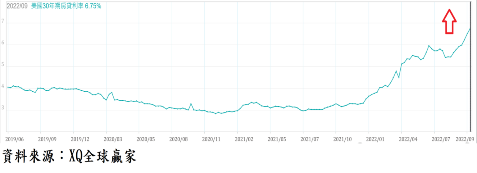 美國30年期房貸利率隨美國聯準會貨幣政策由寬鬆轉向緊縮而快速走高。美國30年期房貸利率由2021年底的3.33%,6月中旬一度短暫達6%以上, 7月最低回檔至5.43%,9月隨Fed再度升息三碼,鮑爾並於會後持續發表鷹派言論,30年房貸利率於9月下旬攀高至6.75%,續創金融海嘯後的最高檔。房貸利率上升將直接對新購屋者造成融資成本上升壓力,勢必對房市買盤造成壓力,超過10年多頭行情的美國房市已由多轉空,對總體經濟的衝擊程度,值得後續高度關注。