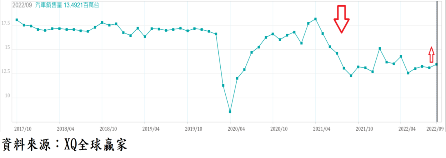 9月新車年率銷售量為1350萬輛,月增3.05%,高於去年同期的1230萬輛,年增9.76%,連續第13月較去年同期負成長後第2個月轉正成長,汽車業景氣進入谷底盤整階段,並未再進一步惡化。