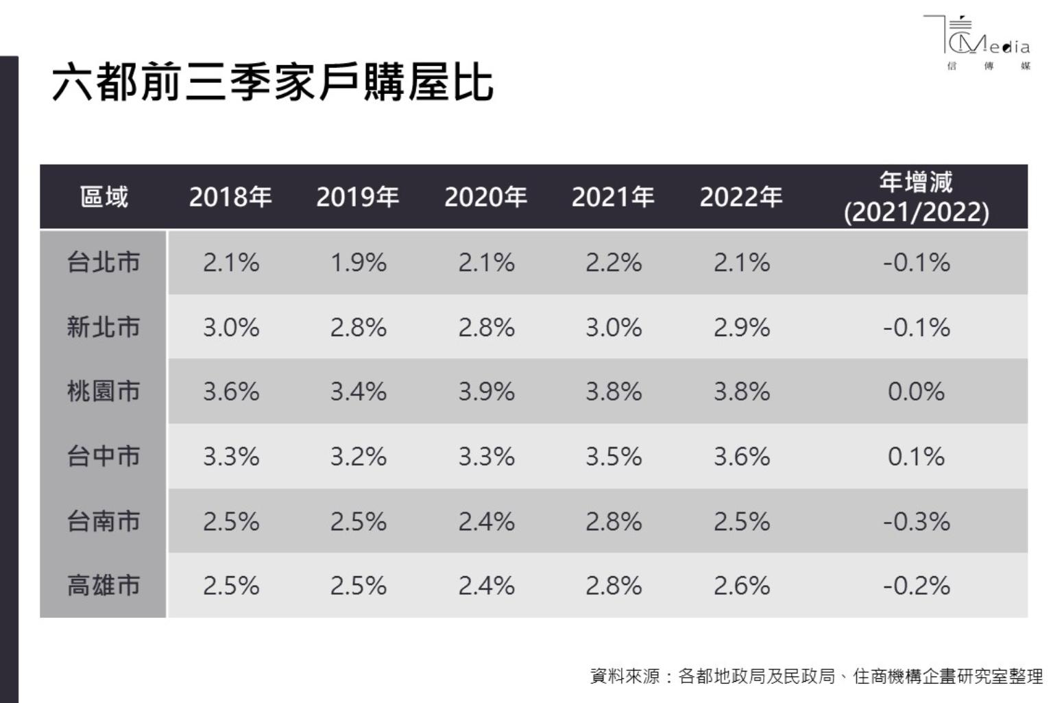 各都家戶購屋比桃園市買氣最高,今年前三季家戶購屋比3.8%,表示平均每一百戶中有3.8戶買房,台中市今年家戶購屋比3.6%,是六都中唯一逆勢成長的區域,南二都今年前三季家戶購屋比降幅較明顯,台南市購屋2.5%,年減0.3個百分點,是降幅最大的區域,高雄市家戶購屋比2.6%、年減0.2個百分點,雙北家戶購屋比都下降0.1個百分點,新北市2.9%,台北市2.1%,台北市這幾年人口外移嚴重,但家戶購屋比仍然是六都最低者。