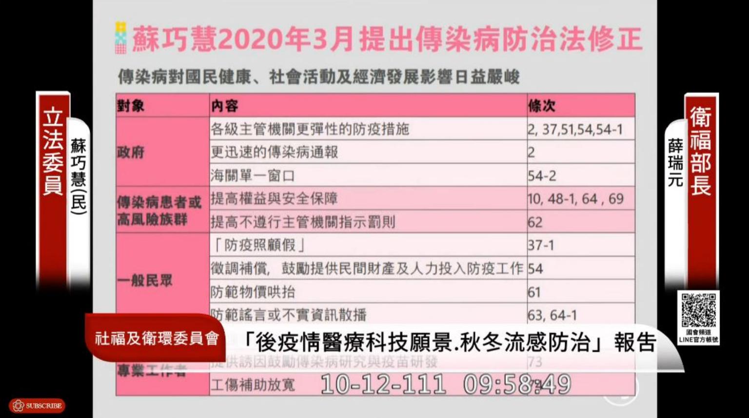 蘇巧慧提到,2020年時就已提出過修正建議版本,建議部長可以參考。薛瑞元表示草案已完成修正,10月中下旬就會預告,「目前第一步是與各部會討論,盤整在這次疫情中碰到的問題、處理方式與相關對策等,都會納入修法中。」