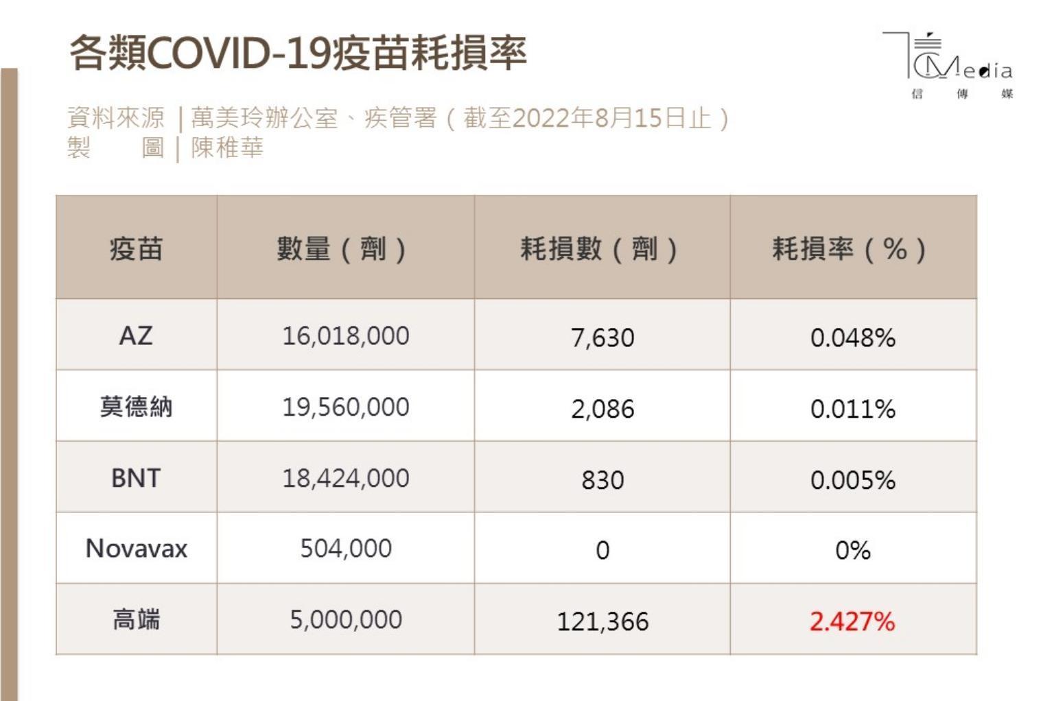 日前國民黨立委林德福在立院質詢中也強調,因為高端疫苗沒有通過國際3期臨床認證,讓國人不敢打、日本官方也不承認。根據萬美玲辦公室提供給《信傳媒》的統計調查,截至今年8月15日止,全國各類COVID-19新冠疫苗的耗損率中,國產高端產量500萬劑中耗損121,366劑,耗損率2.427%為當中最高。
