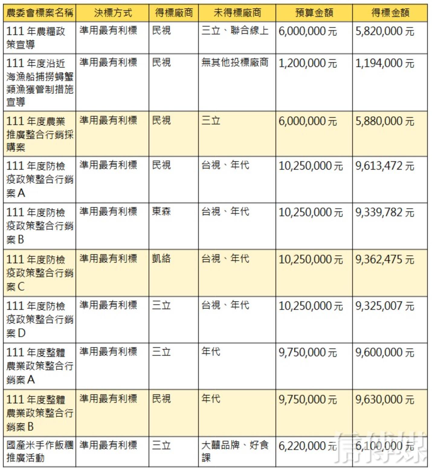 據《信傳媒》掌握資料,今年截至昨(14)日為止,農委會10個媒體採購宣傳標案,民視共得標5案,總金額3,213萬餘元;三立得標3案,總金額2,502萬餘元;東森得標1案,總金額933萬餘元;凱絡得標1案,總金額933萬餘元。