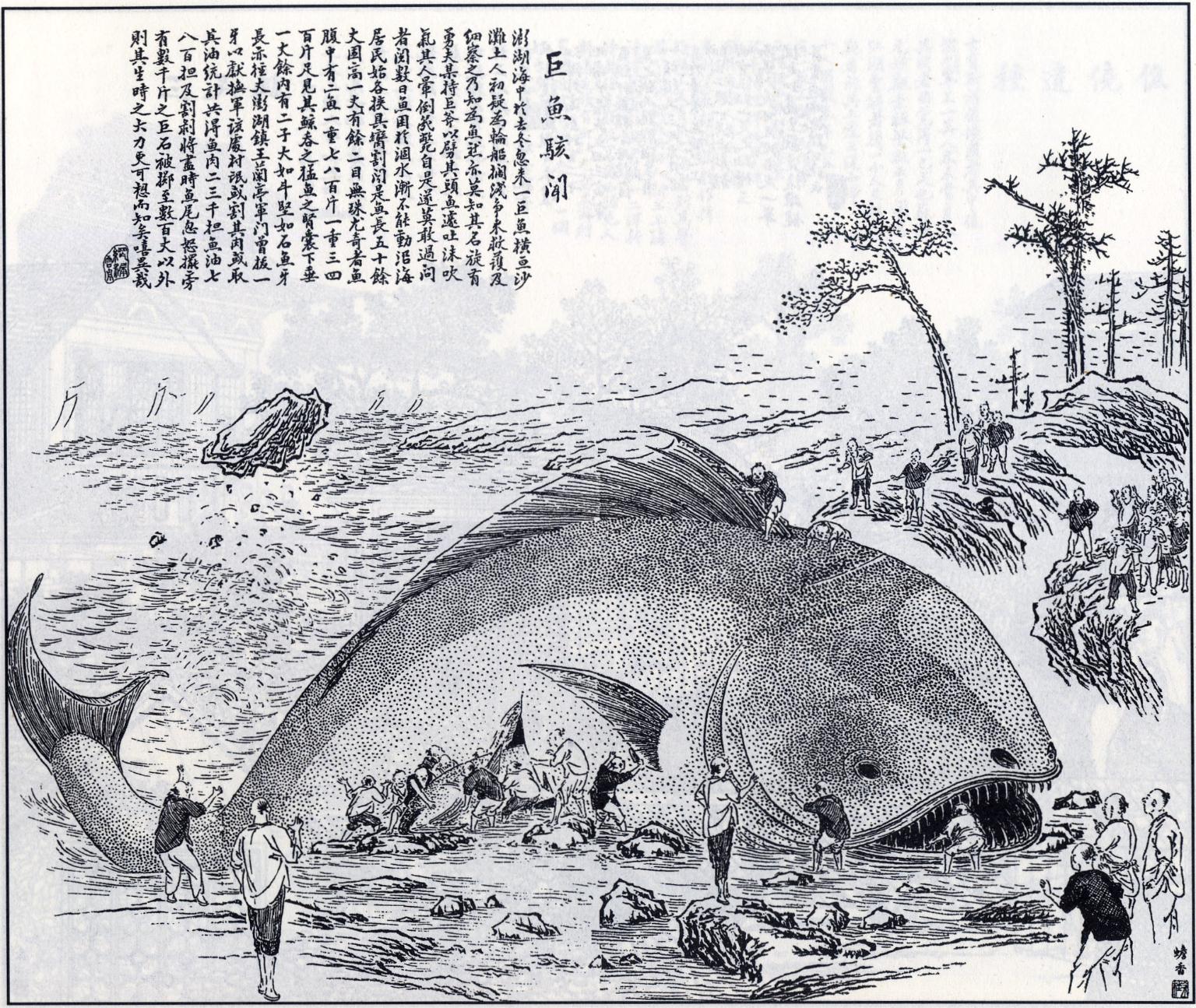 海魚莫大於䱜,長或一、二十丈,三五成群,順流噴浪如雪,山脊翅浮紅水面,如百十赤幟。舟遇之速避,稍遲即可吸口吞舟,故俗名「吞船䱜」。