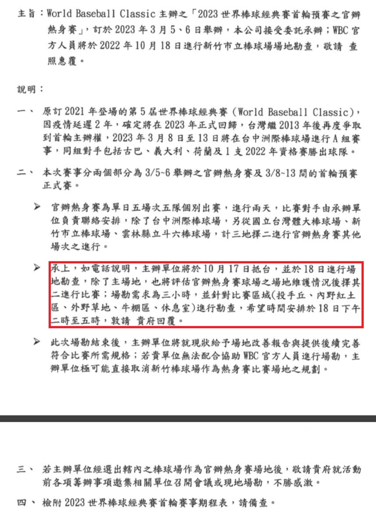 投入12億元改建的新竹棒球場有新話題,民眾黨新竹市長候選人高虹安今日公布,她收到世界棒球經典賽(WBC)承辦單位回函,美國主辦單位預計將於18日前往新竹棒球場進行場地勘查,評估能否作為官辦熱身賽的場地。