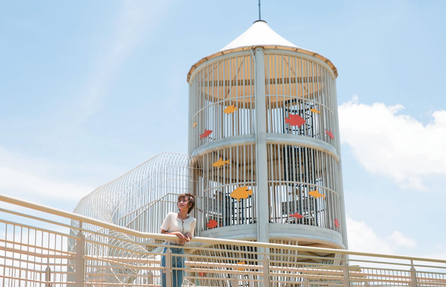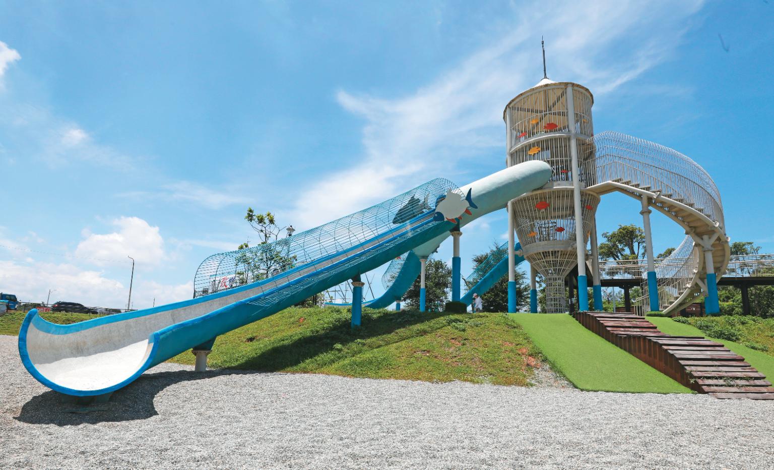 水之丘主題公園最令人眼睛一亮、玩興爆發的是「草魚遊戲場」,場內有一座以在地埤塘特有元素「飼料桶」設計而成的大型溜滑梯,藍白二色的可愛搭配,三線滑道採分齡設計,滑道之間以鑽籠、樓梯連通,上爬下鑽饒富趣味。最高的一道滑梯十分陡峭,高速滑下的驚心動魄讓人來不及驚呼;次高的滑梯採弧形設計,讓人感受峰迴路轉的刺激;若對高速溜滑有所懼怕,可以選擇第三道滑梯,委婉貼心的設計讓所有人都可以在這裡享受遊玩樂趣、找回童心。