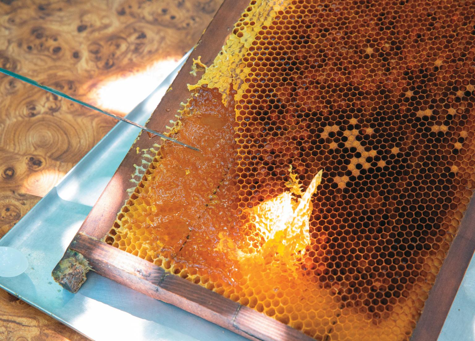 來到這裡,先喝一杯自家祕製的蜂蜜檸檬水,再到放置蜂箱的樹園聽故事。從阿公以一個蜂箱起家的創業史講起,再介紹園區裡的原生蜜源植物,荔枝、龍眼、月桃、白千層,甚至還有一株來自東南亞的山刺番荔枝。全哥輔以燻煙開啟蜂箱,傳授辨認工蜂、女王蜂的祕訣,介紹牠們的習性,再引領觀察蜂巢裡的蜂蛹、蜂蜜和花粉。導覽最後,全哥發給每人一匙現挖的新鮮蜂巢蜜,說明蜂蜜於不同四季的風味差異。另外,絕不能錯過全哥獨家研發中的「雪蜜」,以冷凍乾燥水果打成粉末,結合蜂蜜再結晶,嚐起來竟有冰淇淋般的綿密口感,為炎熱夏天帶點消暑風味。