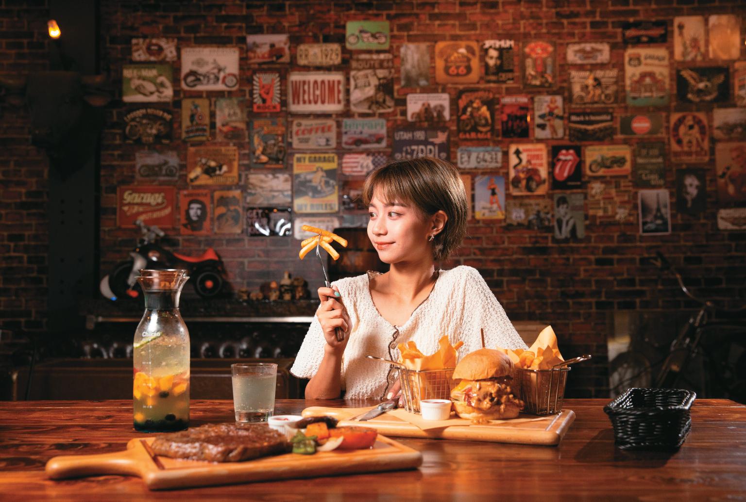 菜單上的美國霜降牛排,就是哈雷車友間口耳相傳的「騎士牛排」,將20盎司的美牛背脊肉以胡椒、鹽簡單調味,直火炭烤後,牛肉的原汁原味搭配滿溢炙烤香氣,每一口都回味無窮;「花生醬培根起司牛肉」也是人氣選項,手打出筋道的牛肉排扎實多汁,與煙燻培根、生菜、雙起司及帶有顆粒的花生醬一同夾入麵包,香氣馥郁且富有層次,令人驚喜的食感在口中連環迸發,再佐以清涼的鮮果氣泡飲,沒什麼比暢快美味更適合作為旅程的收尾。