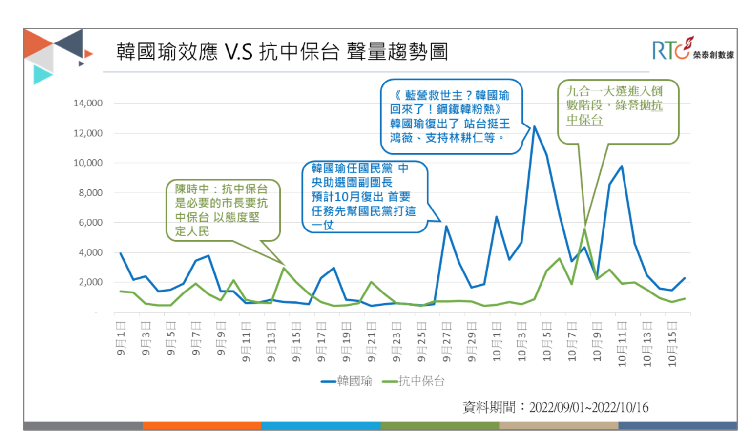 不過,近期傳出民進黨擬打出「抗中保台」牌,國民黨則有前高雄市長韓國瑜復出造勢,究竟藍綠各自打出王牌,有無反應在網路聲量上?