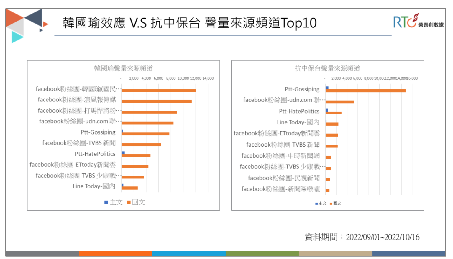 有趣的是,「韓國瑜旋風」及「抗中保台」都是延續2020年總統立委大選的老梗,但2022選戰又再拿出來用時,二者聲量來源,韓國瑜的聲量來源除了其本身的粉專外,大部分來自於偏藍媒體粉專。