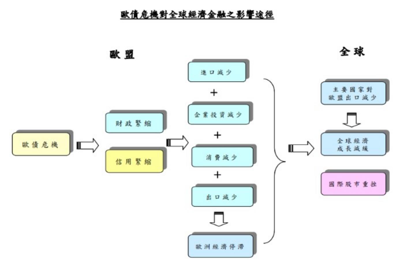 最近歷史上歐洲最大危機就會想到歐債,2010年底希臘、葡萄牙與愛爾蘭的政府外債比皆超過50%,而歐盟三大國法國、德國與英國銀行對這些國家債權曝險約2兆美元,接著銀行信用緊縮導致流動性風險,最後專業機構對2012年全球經濟成長預測持續下修。