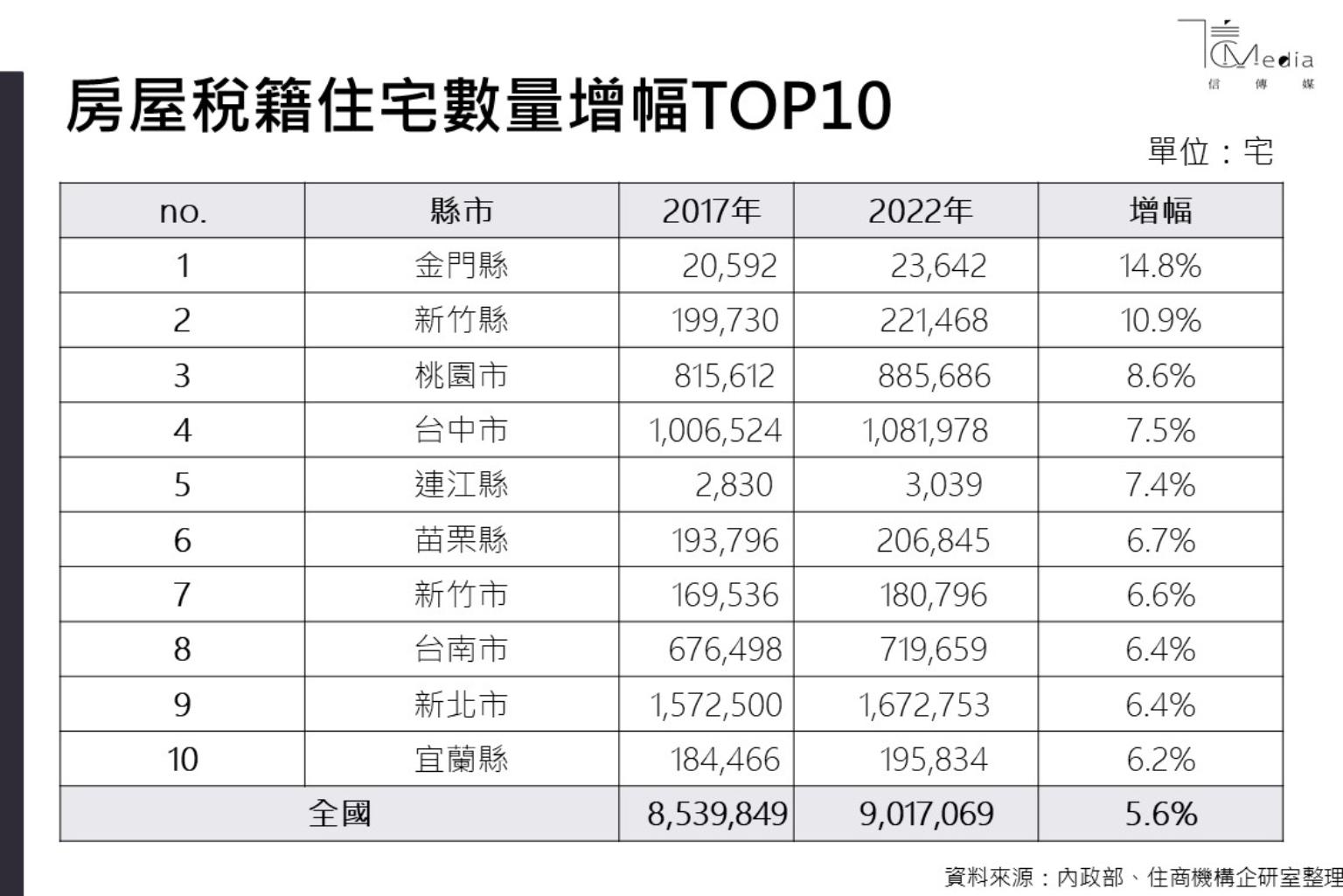 據依內政部最新資料,今年全國房屋稅籍住宅數量超過900萬宅,與五年前相比住宅數量增加5.6%,比較各縣市五年來住宅增長幅度,金門縣以14.8%成長幅度,成為全台住宅成長最快速的縣市,新竹縣增加10.9%漲幅第二高,桃園市增加8.6%排名第三,是六都中住宅數量增速最快的區域。