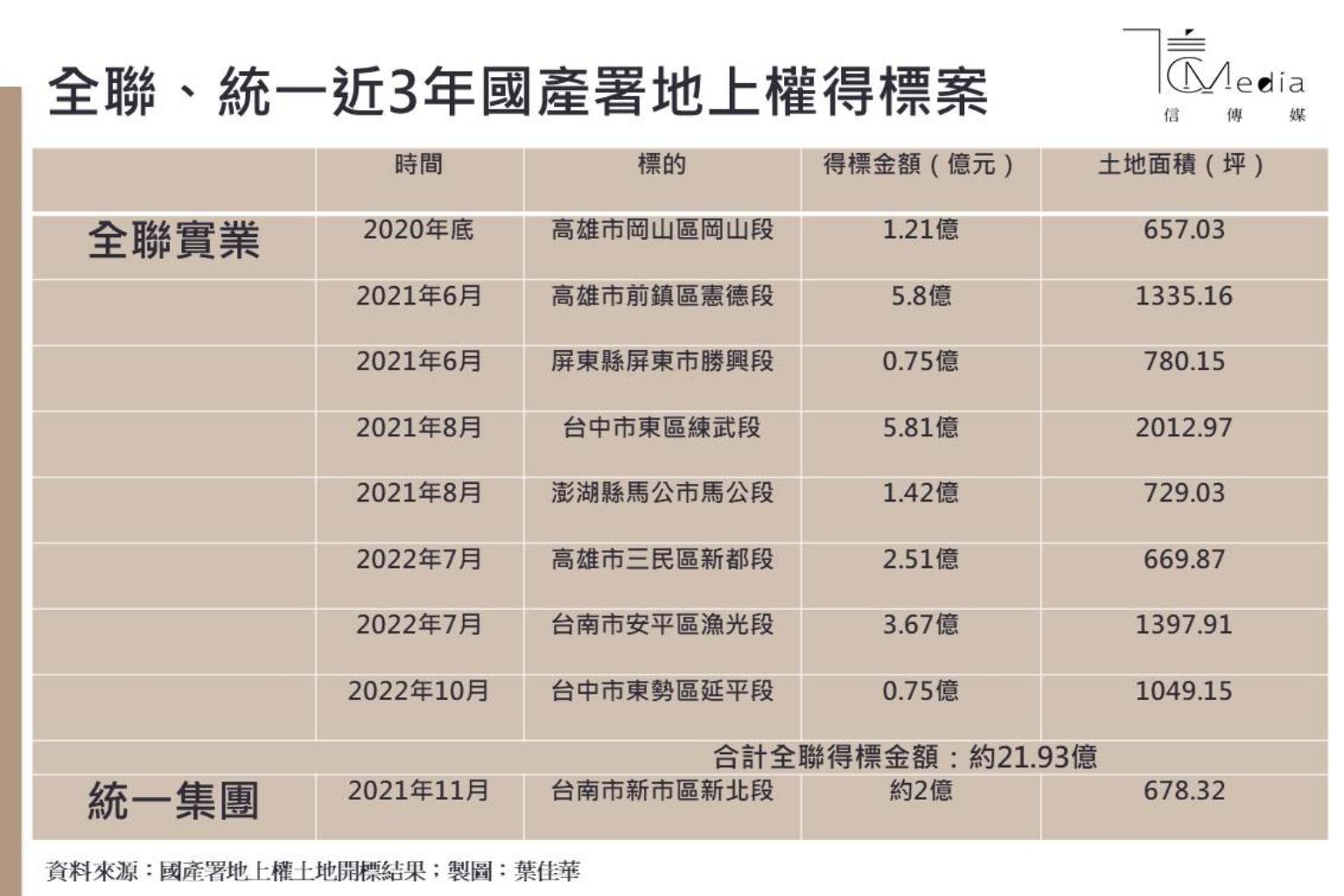 事實上,近年來全聯已成為國產署地上權標案的常客,根據《信傳媒》調查,統計2020年到今年10月為止,全聯搶標中南部地上權合計已砸了超過20億元新台幣,其中包括高雄岡山商業區土地、高雄前鎮憲德段、屏東市勝興段、台中干城、澎湖馬公市區,以及高雄市三民區以及台南市安平區等地上權土地。