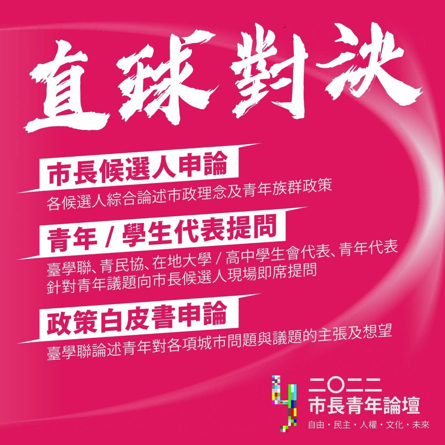 根據了解,本次「2022市長選舉青年論壇」係由台灣學生聯合會(台學聯)、NOWNEWS及台大學生會、政大學生會、世新學生會、台師大學生會、淡江學生會、真理學生會、元智學生會、中央學生會合辦,將會邀請市長參選人與學生們面對面「直球對決」。