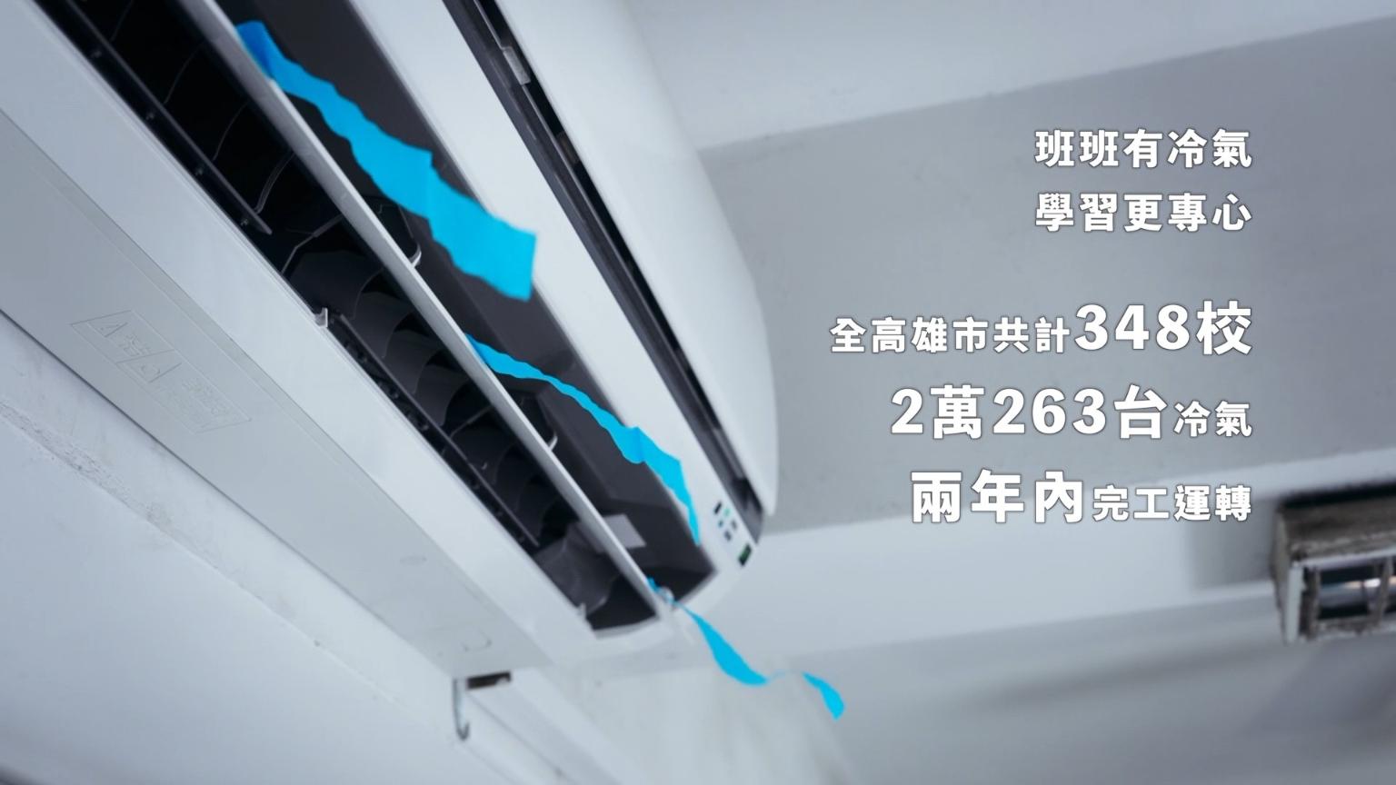 班班有冷氣讓師生上課透心涼,學習更專心,高雄已在2年內完工運轉超過2萬台冷氣,達到「班班有冷氣」目標,高市府還再加碼補助一個月電費,讓學生享受更舒適的學習環境。市府最新短片以曾在台求學、醉心台灣壯麗山林的傑出博物學家「鹿野忠雄」為背景,傳神表現出在裝設冷氣、涼風吹拂的教室內,學生專注認真地聽課,彷彿追隨他的足跡腳步,走進銀白山巔中,臉上流露著神遊的沉醉神情,傳達班班有冷氣讓學習更專心。