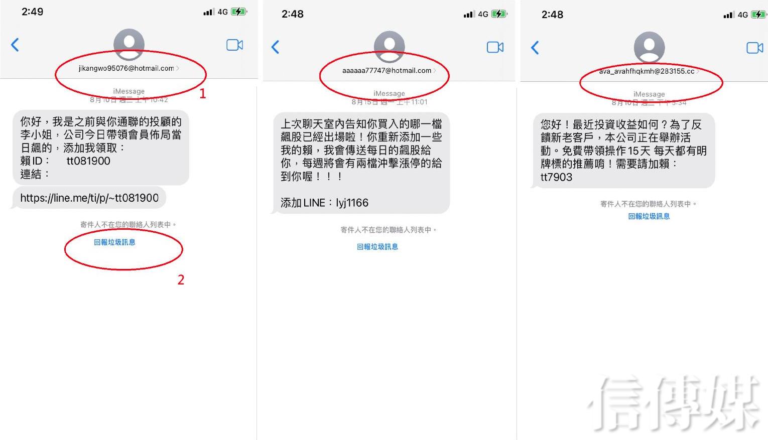 而且垃圾簡訊還會抓準時機發送,例如遇到臺股大跌幾百點,會收到「歷史告訴我們,每當臺海危機出現,都是最好的買點,但能從危機中賺到錢的,永遠是少數人! 股市從來不缺贏家,只要你能把握好翻身的機會,明天你也可以是市場贏家!為推廣公司知名度,前1,000名諮詢者更有機會與國際金融專家面對面交流學習!!!加line 前來診股,領取飆股,逆風起飛!!! 非股民者勿擾聯絡line:s15xxx9」這樣的簡訊。