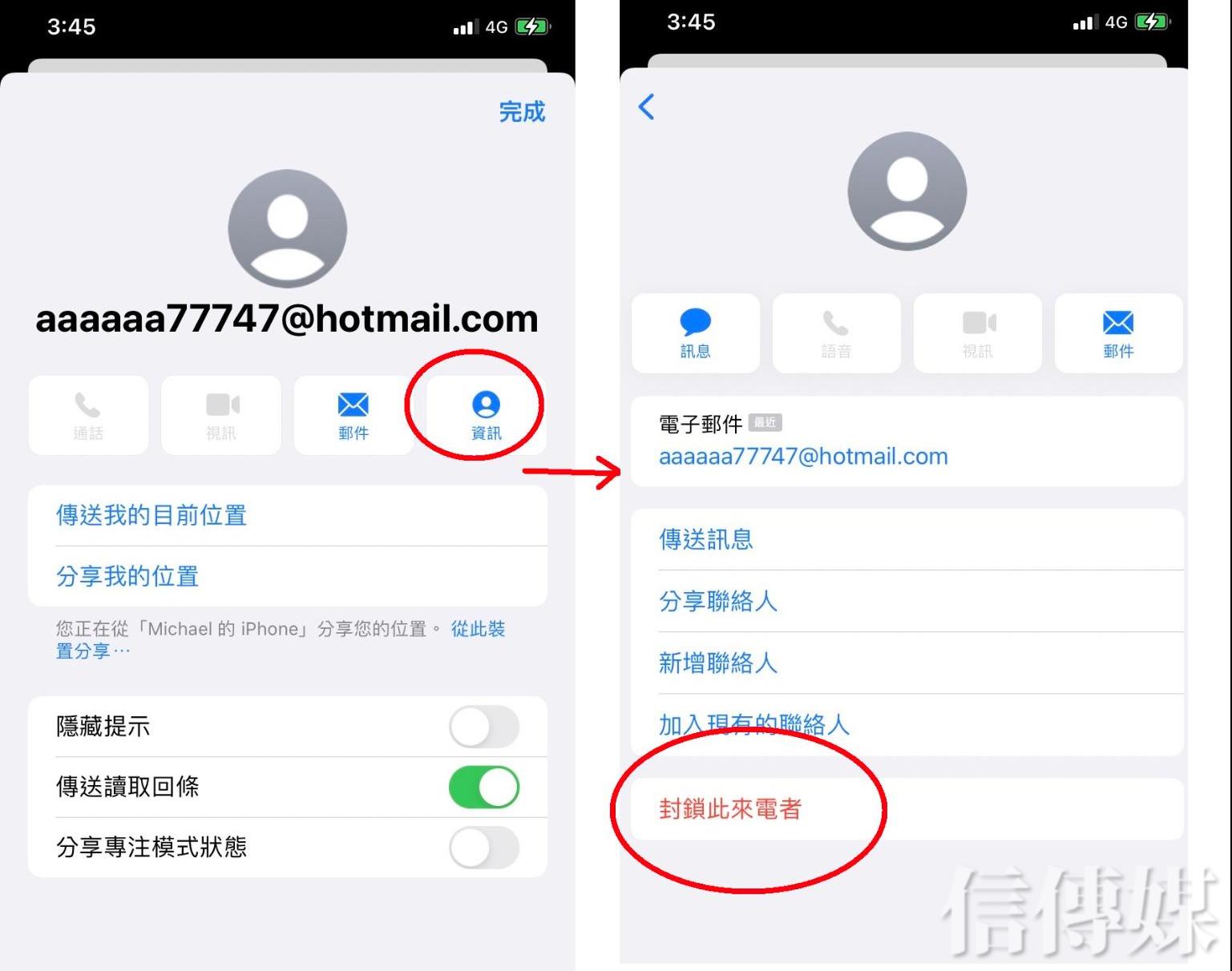 或者是點選來電者的帳號,例如「aaaaaa77747@hotmail.com」,按下去,就會出現另一個畫面,先按下右上角的「訊息」,進入下一個頁面後,並點擊最下方的「封鎖此來電者」即可。