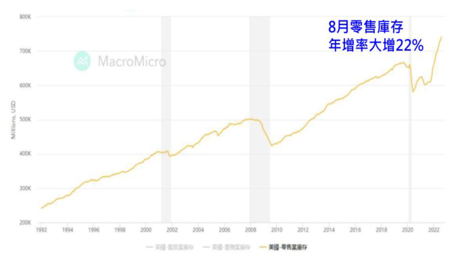 法人認為,11月6日以後美股四大指數及個股股價,反應基本面景氣及獲利不佳而開始大幅修正,且在2023年上半年美國經濟及企業獲利未落底,尤其目前美國零售庫存破表而且又大創新高,見上圖美國零售庫存金額所示,在存貨調整未結束完畢之前,不僅美股難有行情,甚至還有大幅下修的風險。