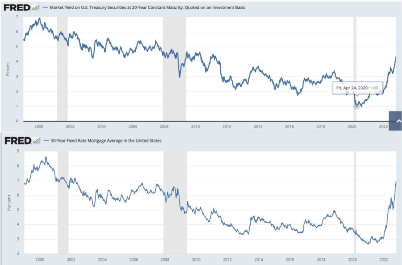 因為俄烏戰爭不趕快結束造成供應鏈斷鏈引發高通膨危機、FED 維持鷹派升息打擊通膨引發強勢美元及公債殖利率大升,造成新興市場持續面臨資金外流, 衝擊全球經濟陷入停滯及下降,也造成大多數企業獲利大幅下降甚至衰退、目前美國房地利率也高於 2008 年金融風暴前,見下圖二所示,但當時核心 CPI 僅2.5%,會讓 FED 持續升息。