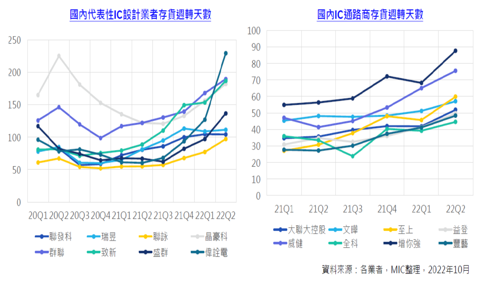 因為 IC 設計公司下給晶圓代工廠的晶片單,至少要在生產製造前的 1~2 季就送達晶圓代工廠跑設計、製造光罩、準備投單生產等等過程,台積電不會讓 IC 設計公司砍第三季及第四季下單量,且將生產出來的晶片交給 IC 設計公司,造成上半年庫存已破表的 IC 設計公司,下半年庫存再大幅增加也會變成 IC 設計公司可怕的噩夢,見下圖國內代表性 IC 設計業者 6 月底存貨週轉天數所示。