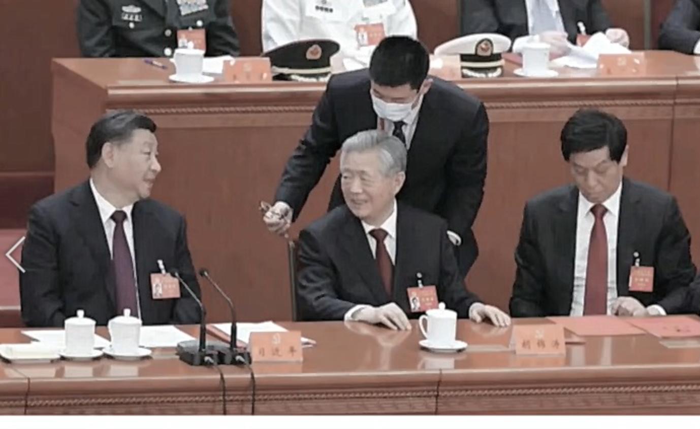 孔對胡錦濤說,「跟我離開我幫你安排。」這時候栗戰書拿著胡錦濤的文件低頭在看的時候,外界沒注意到的漏網鏡頭是,韓正站起來瞄了過去,一看傻眼了。王滬寧的眼神就對著習近平,他們兩人是用眼神溝通的。
