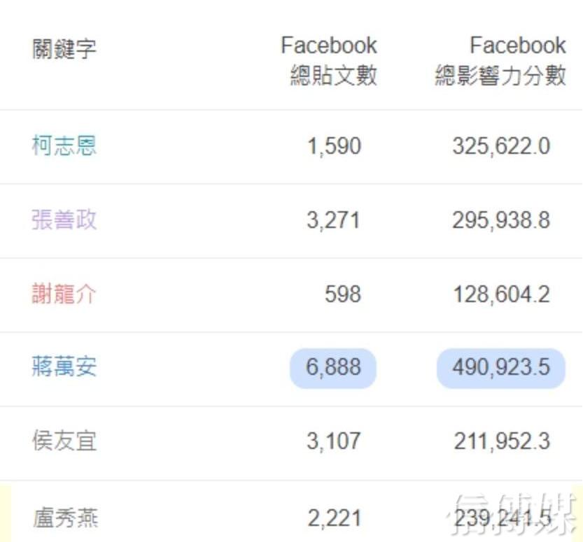 值得注意的是,相較於侯友宜固守北台灣、盧秀燕固守中台灣,南台灣則有一顆新星正在崛起。根據國民黨內部數據,統計9月28日至10月19日,柯志恩在Facebook的影響力分數達到32.5萬,僅次於蔣萬安的49萬,而比侯友宜的21.1萬及盧秀燕的23.9萬還高。