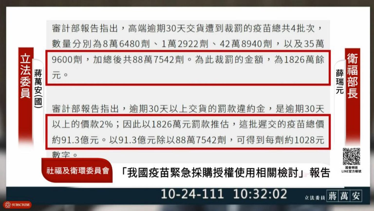 蔣萬安接著指出,高端公開財務報表顯示去年疫苗出貨量為481萬劑、營收36.2億,用簡單的數學回推一劑就是700多元。「另外再看審計部的資料,他們有看到完整衛福部跟高端採購合約的內容,合約內容提到如果高端逾期交貨要罰2%,資料顯示有88萬7,542劑疫苗逾期,裁罰1,826萬餘元,回推的話一劑是1,028元。」