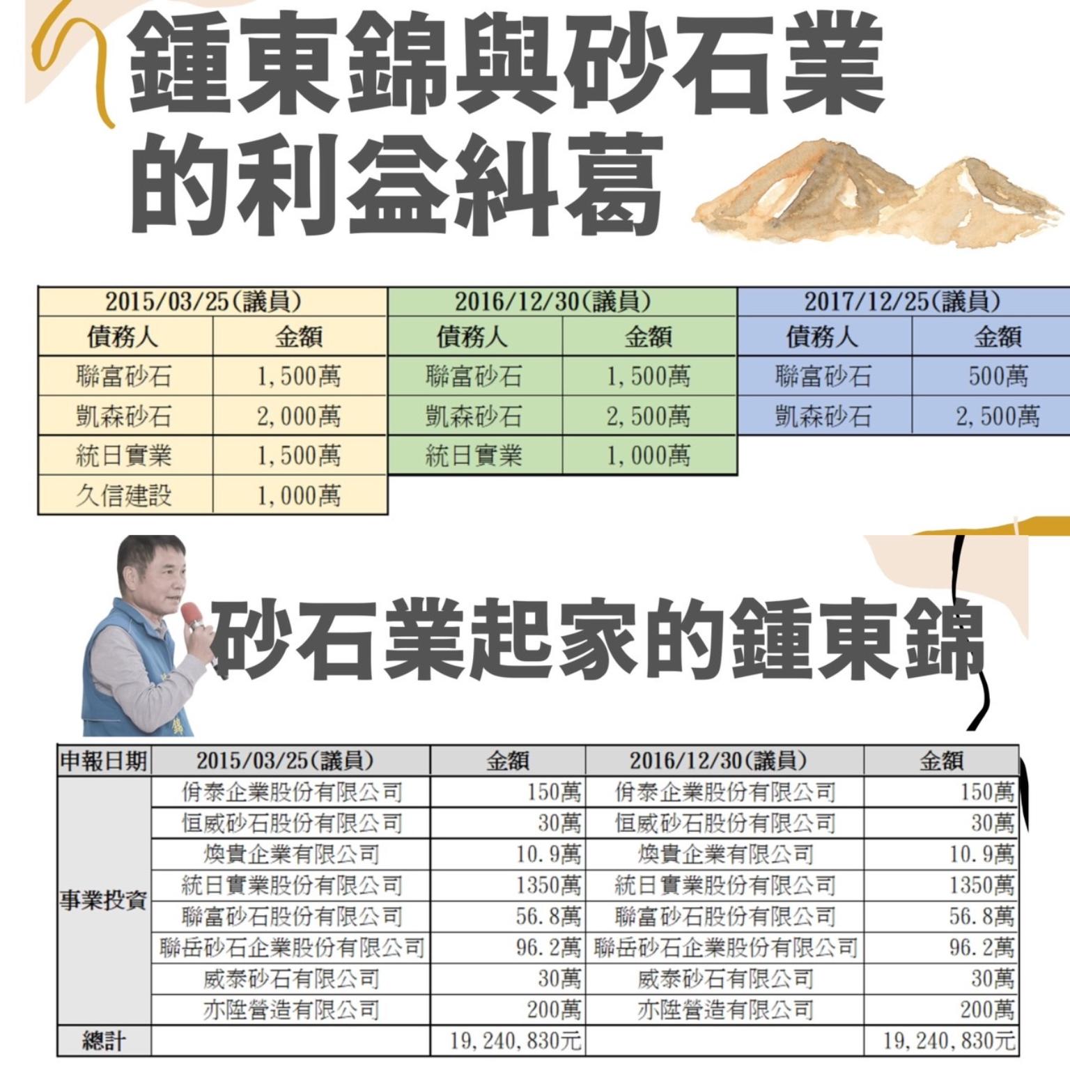 羅致政說, 鍾東錦不止本身是砂石業,還用有其他形式介入其他砂石公司,就是透過借款,2015年、2016年財產申報,都顯示他借給砂石業1500萬~2600萬元不等 ,還被爆料所謂土地租給砂石業者堆積,「表面上不是股東,但是用土地租借介入,顯示他的財產申報並非全貌。」
