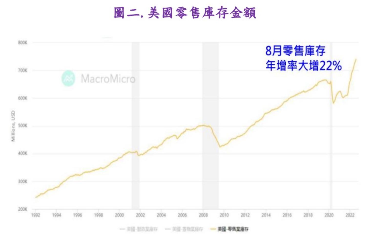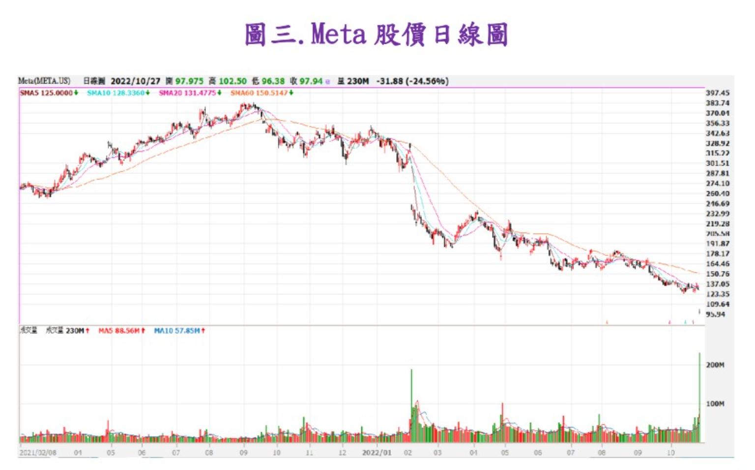 8月份美國零售庫存破表而且又大創新高,見下圖二.美國零售庫存金額所示,預期未來將會有一段時間調整,不利廠商補貨需求;在景氣及企業獲利下滑,以及存貨調整未結束完畢前,不僅美股難有行情,甚至企業獲利還有大幅下修的風險,也會影響股價表現。例如Meta股價在今年2月初公布獲利低於預期使得股價崩跌超過26%,誰知Meta股價大跌10個月後,10月27日股價又出現大跌24.56%,元宇宙吹捧出來的Meta不會有很多的獲利貢獻,股價很像2000年網路泡沫破滅那樣情況,見下圖三.Meta 股價日線圖所示,也真的印證一句話:一旦股市走空,不要猜底部在哪裡?因為,往往還有更便宜的股價,天天都便宜。