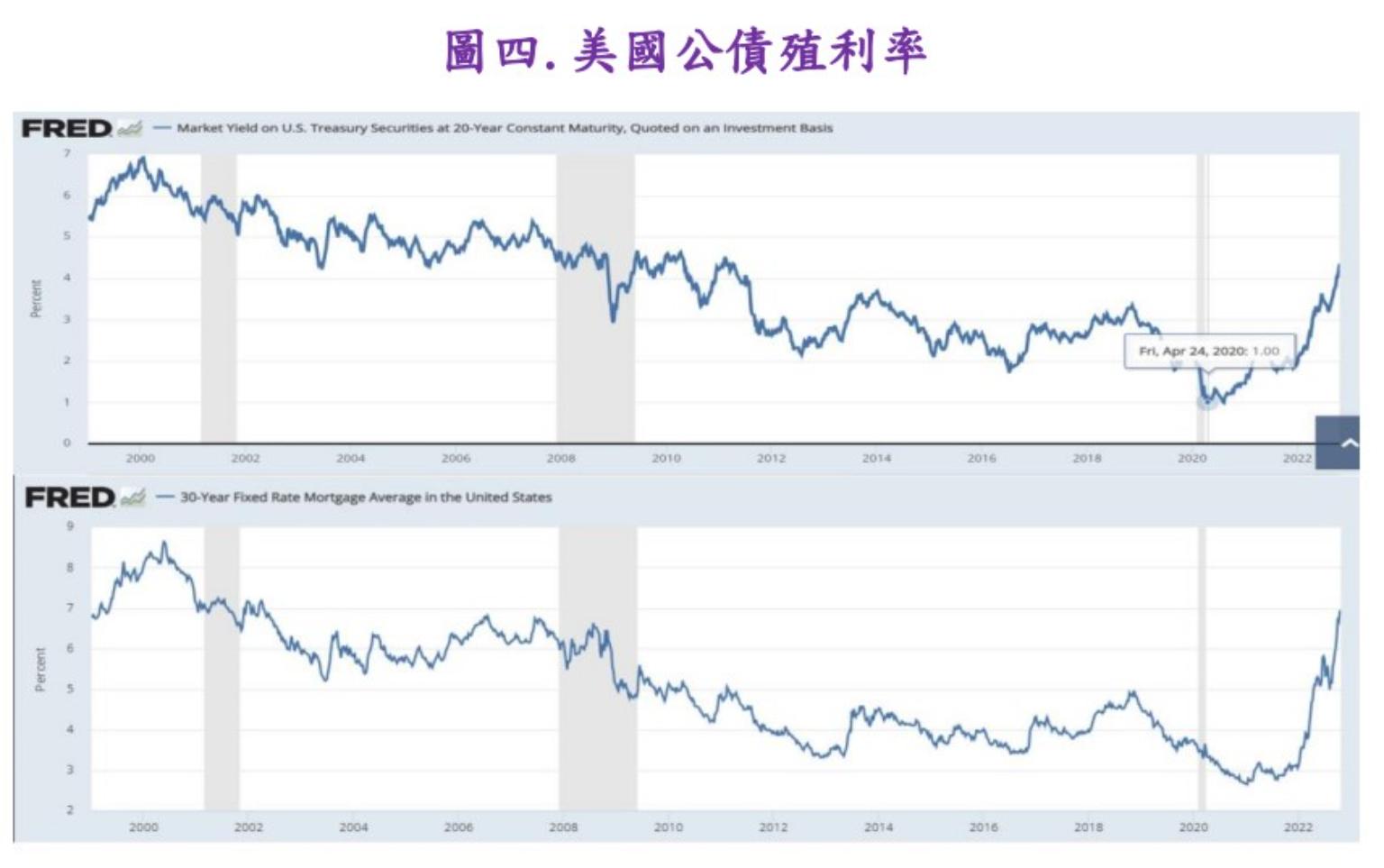目前美國房地利率高於2008年金融風暴前,見下圖四所示,當時核心CPI僅2.5%~3%,目前則在5%上下,升息壓力也造成房地產需求大減及拋售潮;加上公債殖利率超過4~4.5%以上,個股股價殖利率沒超過5%~6%將欠缺投資吸引力。