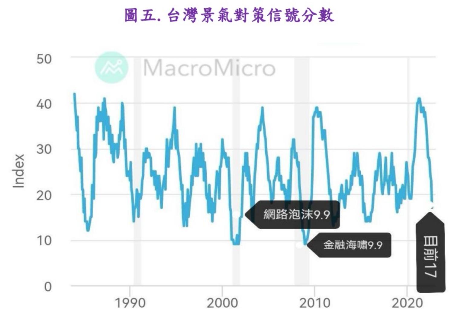 目前台灣經濟指標也才下滑到半山腰,離落底時間可能至少還有兩季以上的時間,例如目前台灣景氣對策信號分數在17分,見下圖五所示,比一般情況下的谷底分數還要來得高,更遑論比較2000年網路泡沫跌到9.9分,以及2008年金融風暴跌到9.9分的情況;而且目前全球景氣恐怕也已經比2020年2月疫情發生前還差,怎麼可以說台股目前已是低點位置呢?