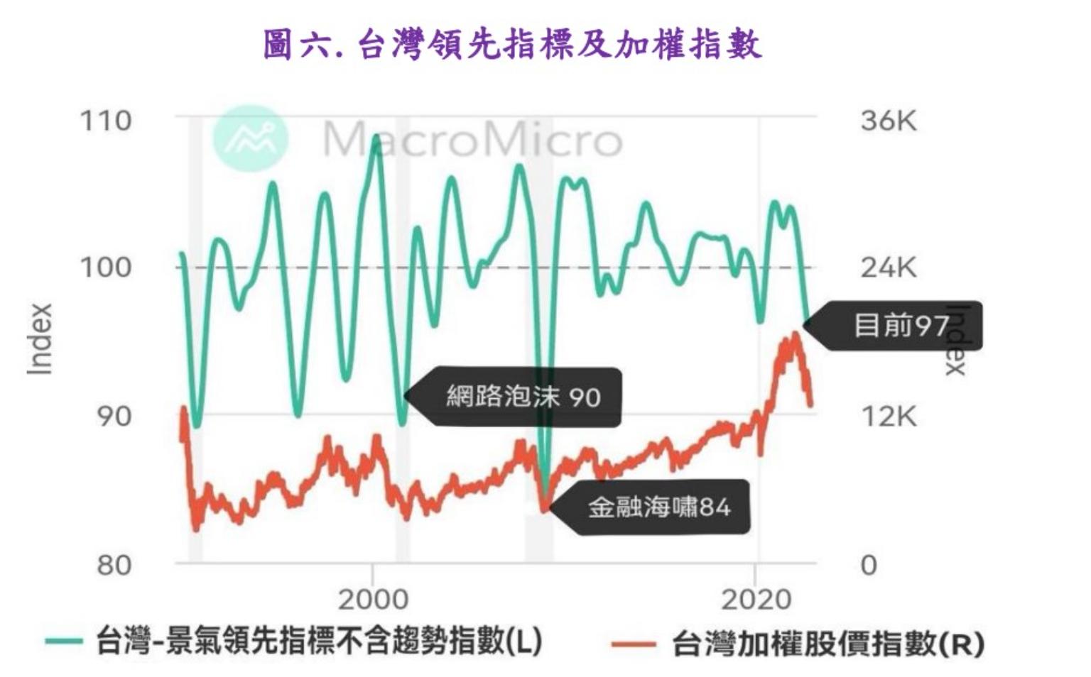 再觀察台灣領先指標來說,目前領先指標才下滑到97,也比一般情況下的谷底分數還要來得高,更遑論比較2000年網路泡沫跌到90,以及2008年金融風暴跌到84的情況,見下圖六所示。