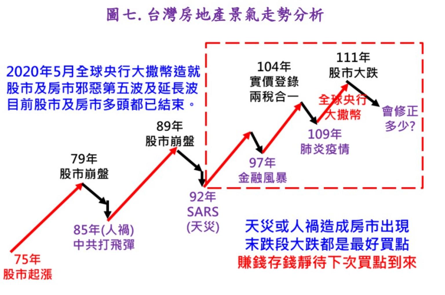 法人預期,從民國92年5月SARS結束以來的19年房地產大多頭已結束,因為這次房地產價格將隨股市泡沫破滅、近期大量蓋好的房地產供給大增、兩岸關係緊張、升息而有下修的空間,可能房地產價格會往下修正好幾年。因此,做房地產的業主自己要有風險意識,不能槓桿操作太大,唯恐資金被卡死及利息壓得喘不過氣,現金為王才有機會在未來買便宜的土地!若是最近一兩年有想要買房的朋友,如果是自住的話,最快可在明年下半年買,或後年上半年擇機買進,預期未來價格應該會下跌1~2成以上,至少也會比今年初便宜。