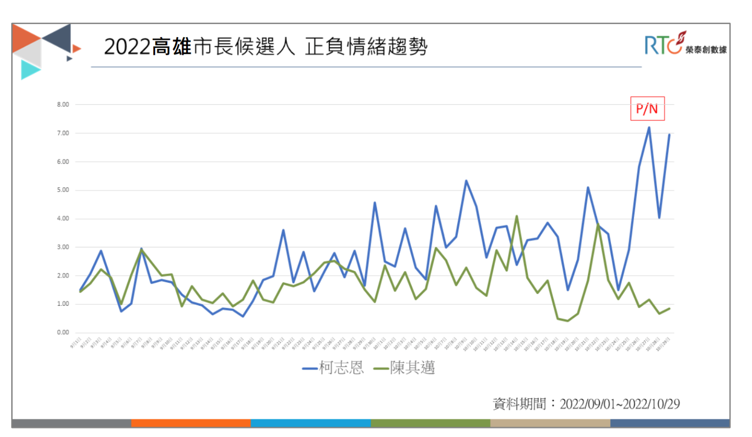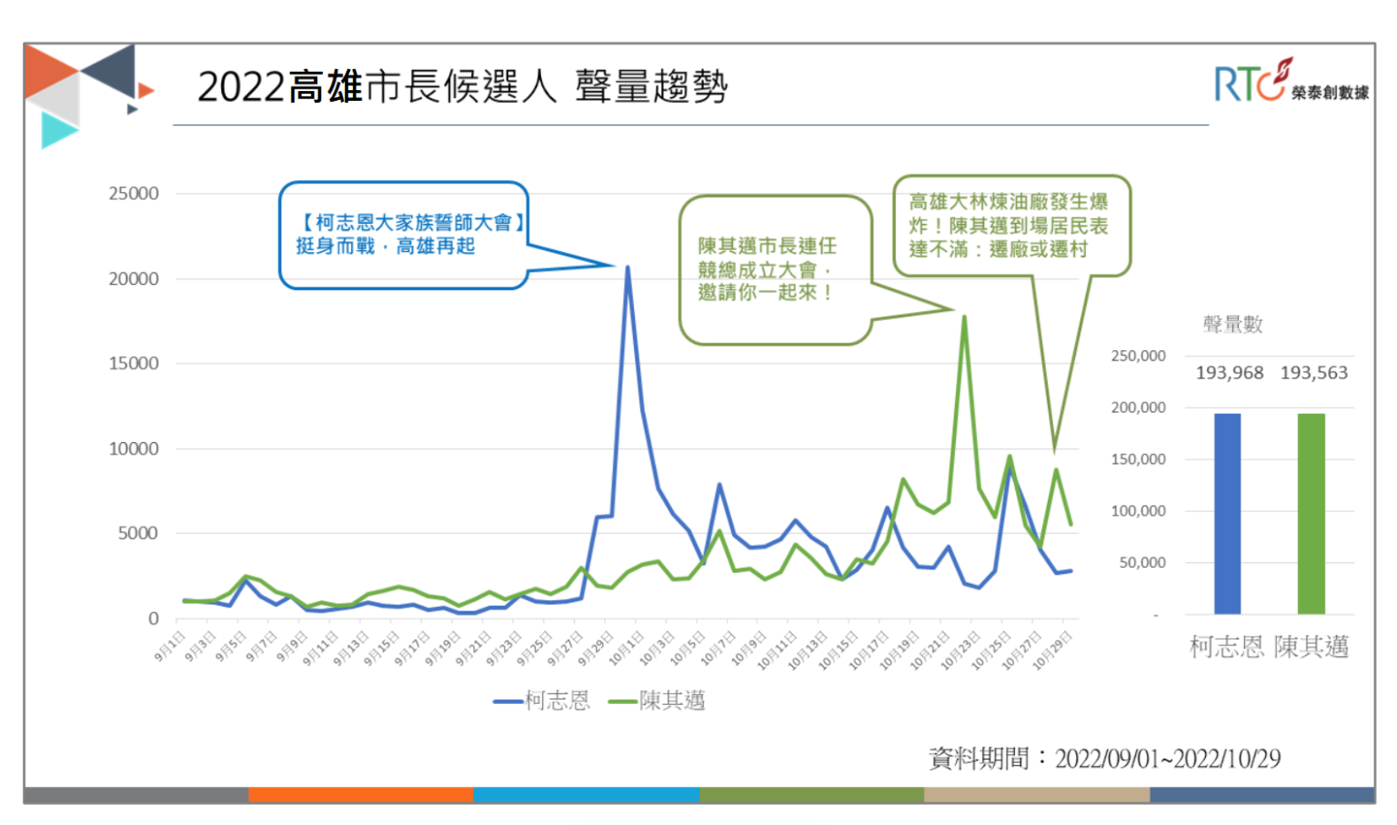 其實從觀察聲量趨勢來看,因為選情冷,加上陳其邁有連任優勢,前期都以市政為主,競選活動少,10月以前兩人的聲量都很低,直至9月30日柯志恩首場大型造勢活動「柯志恩大家族誓師大會」在台糖物流園區舉辦,前總統馬英九、朱立倫、侯友宜與盧秀燕到場相挺,才創造出最高聲量,讓高雄市長的選情稍稍升溫。陳其邁也於10月開始聲量逐漸提升至10/22日連任競總成立大會,聲量來到近期高點。