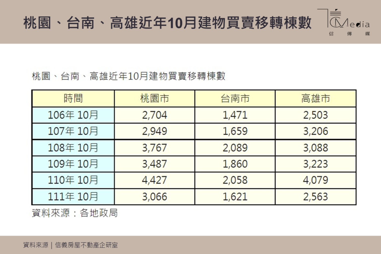 統計已經公布的桃園、台南與高雄的建物買賣移轉棟數,桃園市10月建物買賣移轉棟數3066棟,月減16%,且創下近4年同期新低,台南市10月建物買賣移轉棟數1621棟,月減8%,高雄市2563棟,月減7%,台南與高雄雙雙寫下5年同期新低紀錄。