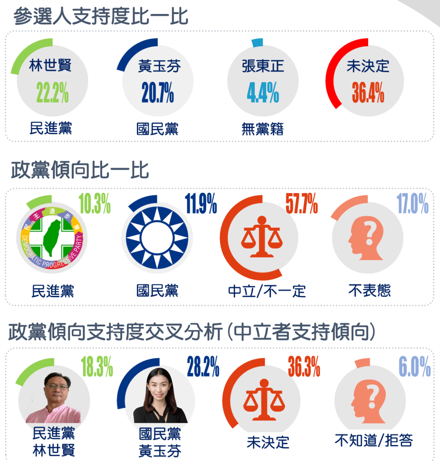 據一份國民黨委託專業機構所做的近期民調,林世賢暫獲22.2%支持,黃玉芬則獲得20.7%支持,雙方差距僅1.5%,至於張東正只獲得4.4%的支持,另有36.4%市民未決定或不知道、拒答。另從政黨傾向進行交叉分析,自認為「政黨屬性中立」的民眾接近6成,但當中有28.2%支持黃玉芬。