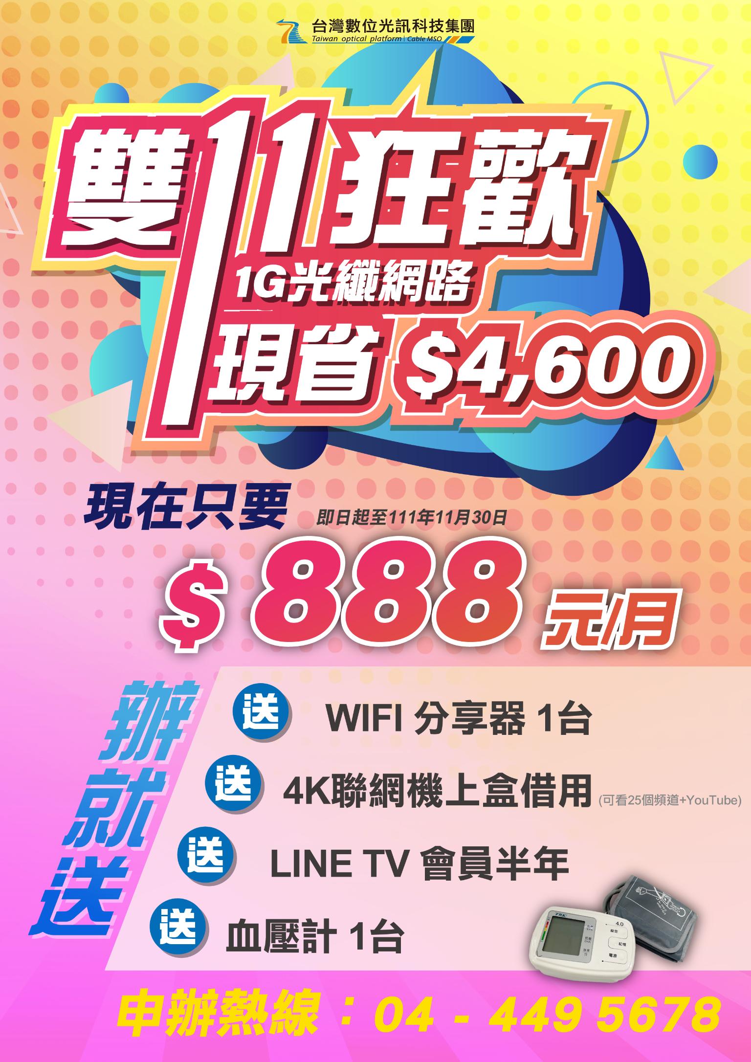 迎接雙11購物季,台數科集團祭出新申辦1G光纖上網豪華包,真正光纖入戶(FTTH),限時優惠每月只要888元,期間申辦再免費提供4K智慧聯網機上盒,讓消費者可收視LINE TV,雙11購物期間,再贈送一台血壓計,讓您在家 開心上網還顧到健康。優惠方案可幫用戶省下近5,000元。