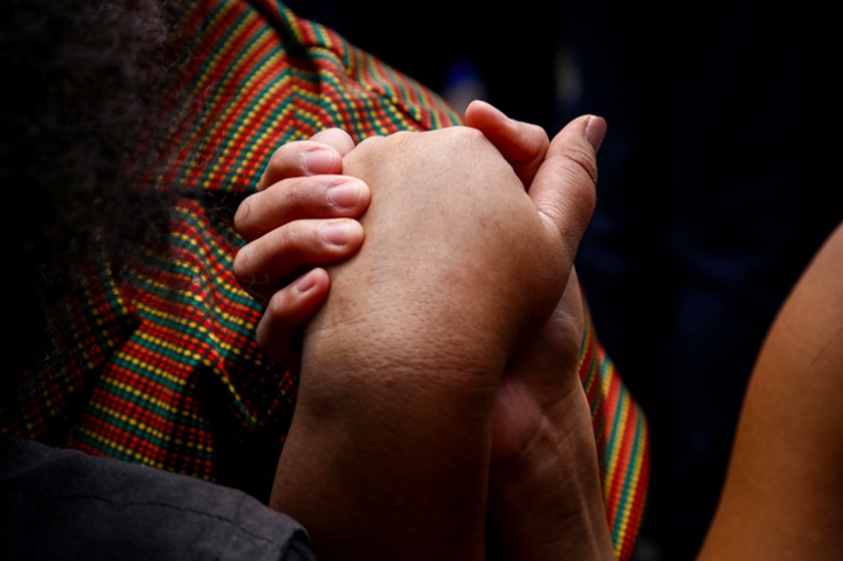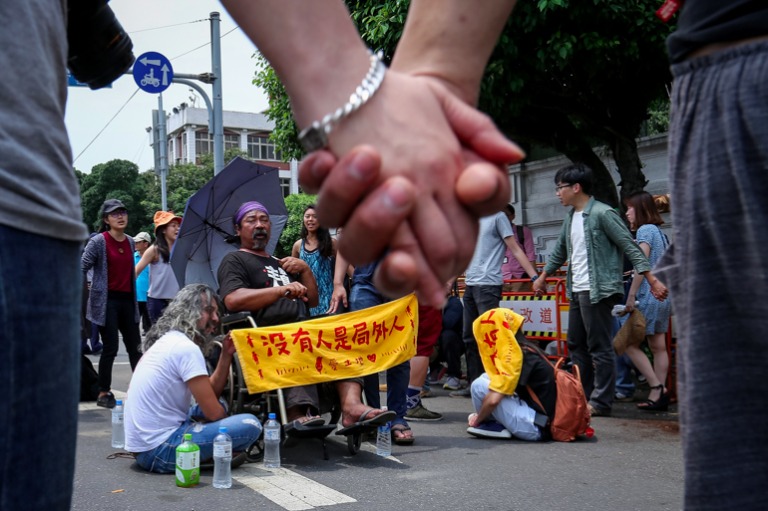 於凱道靜坐不滿警方拆除的原民朋友們,手牽手繞起圈並高聲歌唱。