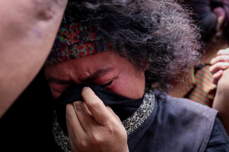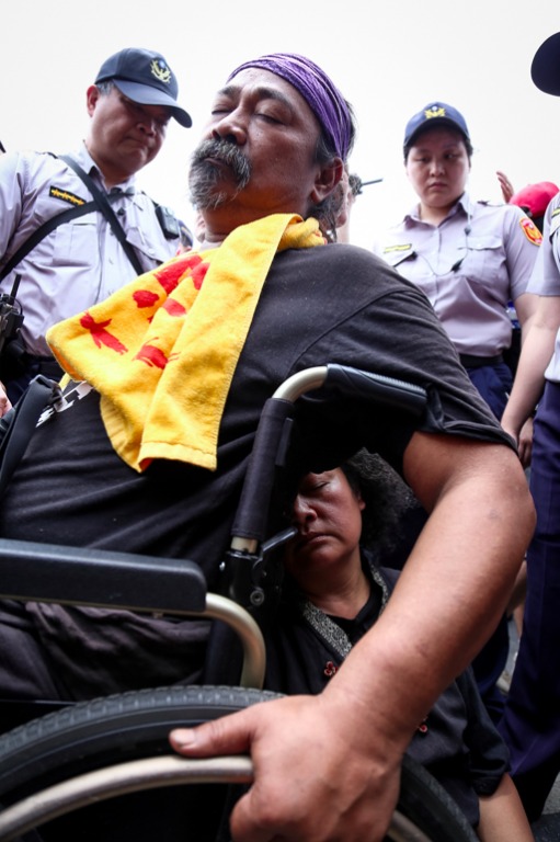 那布(左)、巴奈(右)在警方的勸離下,依然緊閉雙眼,用沈默表示抗議。