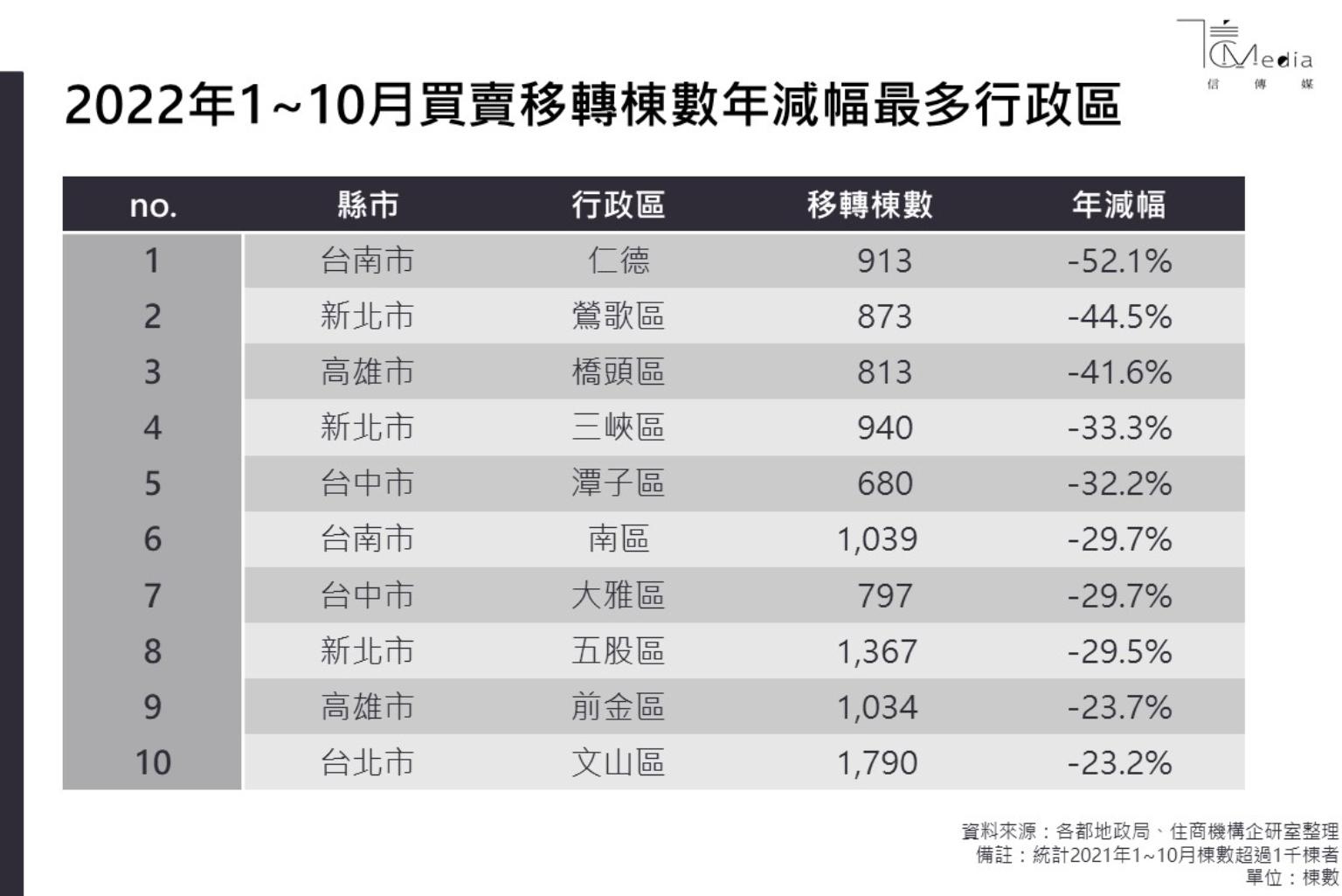 綜觀六都今年買賣移轉棟數減少最多的行政區,台南仁德區數量腰斬,其次依序為新北市鶯歌區年減44.5%、高雄市橋頭區年減41.6%、新北市三峽區年減33.3%、台中潭子區年減32.2%,今年減幅最大的前五個行政區,買賣移轉棟數都比去年同期少3成以上。