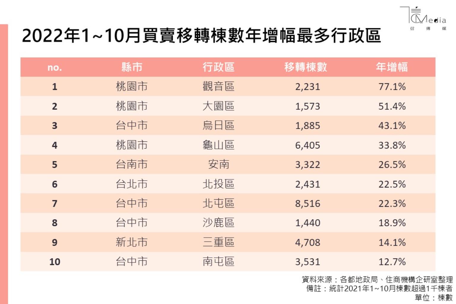 至於今年前10個月買賣移轉棟數增加的區域,郎美囡指出,大部分是2017年以來新屋市場推案量大的區域,尤其台中市及桃園市諸多重劃區供給大量新案,今年尚有交屋量支撐,不過熱錢之外,也有買方以生活機能為購屋取向,如新北市三重區共有6座聯外橋、6個捷運站,在大台北地區屬交通便利性極高的區域,因此買盤相對穩健,前10個月還有超過1成的增長。
