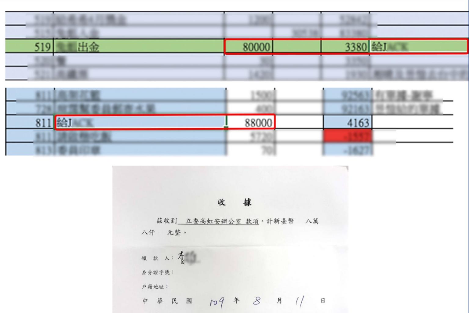 林耕仁續指,其中最讓人好奇有2筆支出,分別是8萬元及8萬8,000元,支出名目居然是「給某位英文名J開頭之助理」,而根據留存的領據,赫然可見原來是李姓前助理領走現金,一次8萬8、一次8萬,總共16萬8;而這11個月期間,經計算公費助理一共上繳87萬5,861元,這個金額已接近高虹安國會辦公室11個月內可申請公費助理加班費的最高上限933,592元。